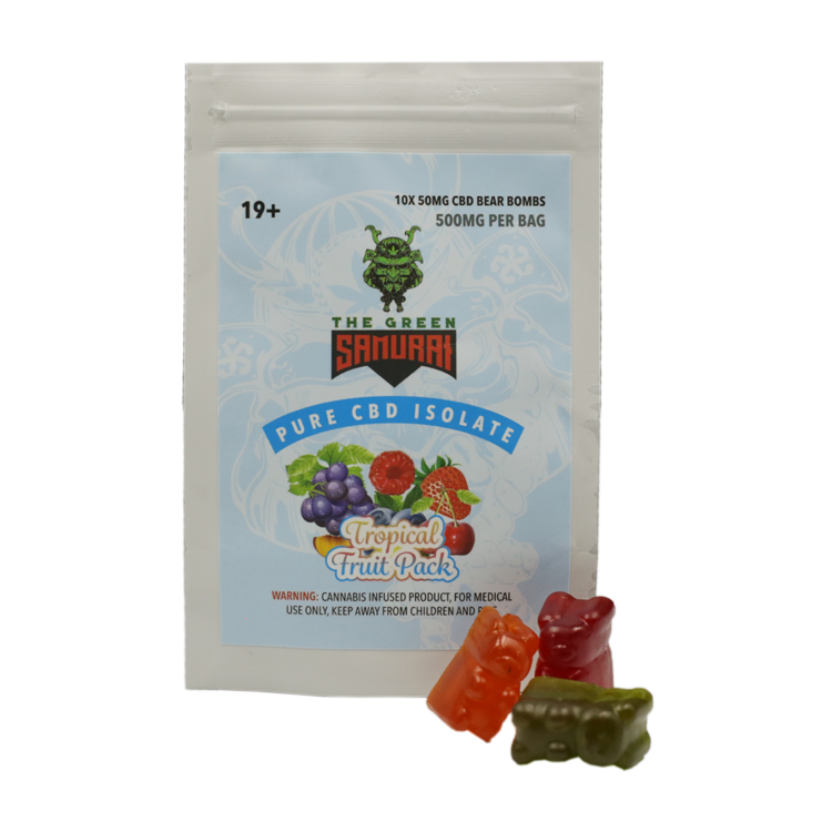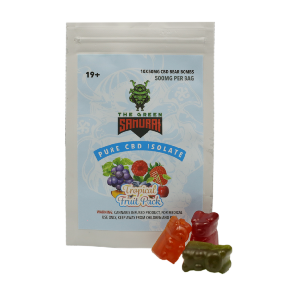 The Green Samurai edibles have perfected the delicate art of creating cannabis and Pure CBD Isolate infused edibles that still retain a delicious flavor with their cutting-edge techniques. Every tasty Tropical Fruit Gummy Bear is infused with 50mg of CBD for perfect, precise dosing. Slice and dice away from your stress, pain, and worries with The Green Samurai Tropical Fruit Pack Gummy Bears!